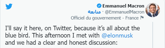 اعلن الرئيس الفرنسي إيمانويل ماكرون في تغريدة ، إنه التقى الملياردير الأميركي إيلون ماسك مالك شركة تويتر، ، وناقشا الجهود التي يتعين على تويتر بذلها للامتثال للوائح الأوروبية.